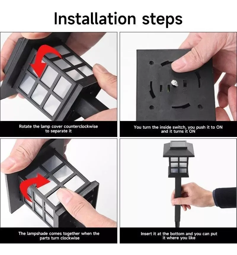 impermeable: las luces solares para exteriores están hechas de ABS de alta resistencia y los postes están hechos de plástico duradero, resistente a la intemperie y a los impactos.