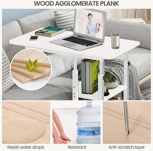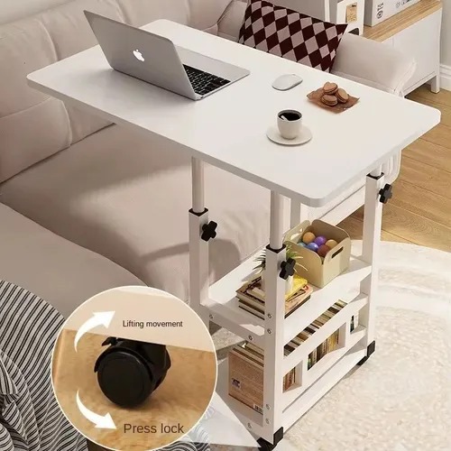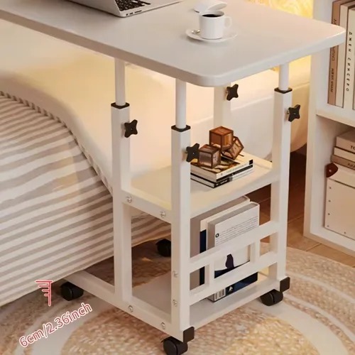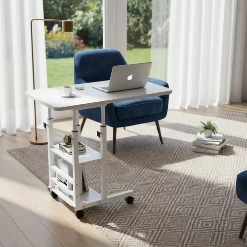 Esta mesa auxiliar con ruedas y altura ajustable es ideal para trabajar, estudiar o disfrutar del desayuno en la cama o en el sofá. Su diseño moderno y robusta construcción la hacen perfecta para tu hogar, oficina o dormitorio. Cuenta con dos estantes inferiores para libros o artículos decorativos, y su acabado blanco complementa cualquier decoración.